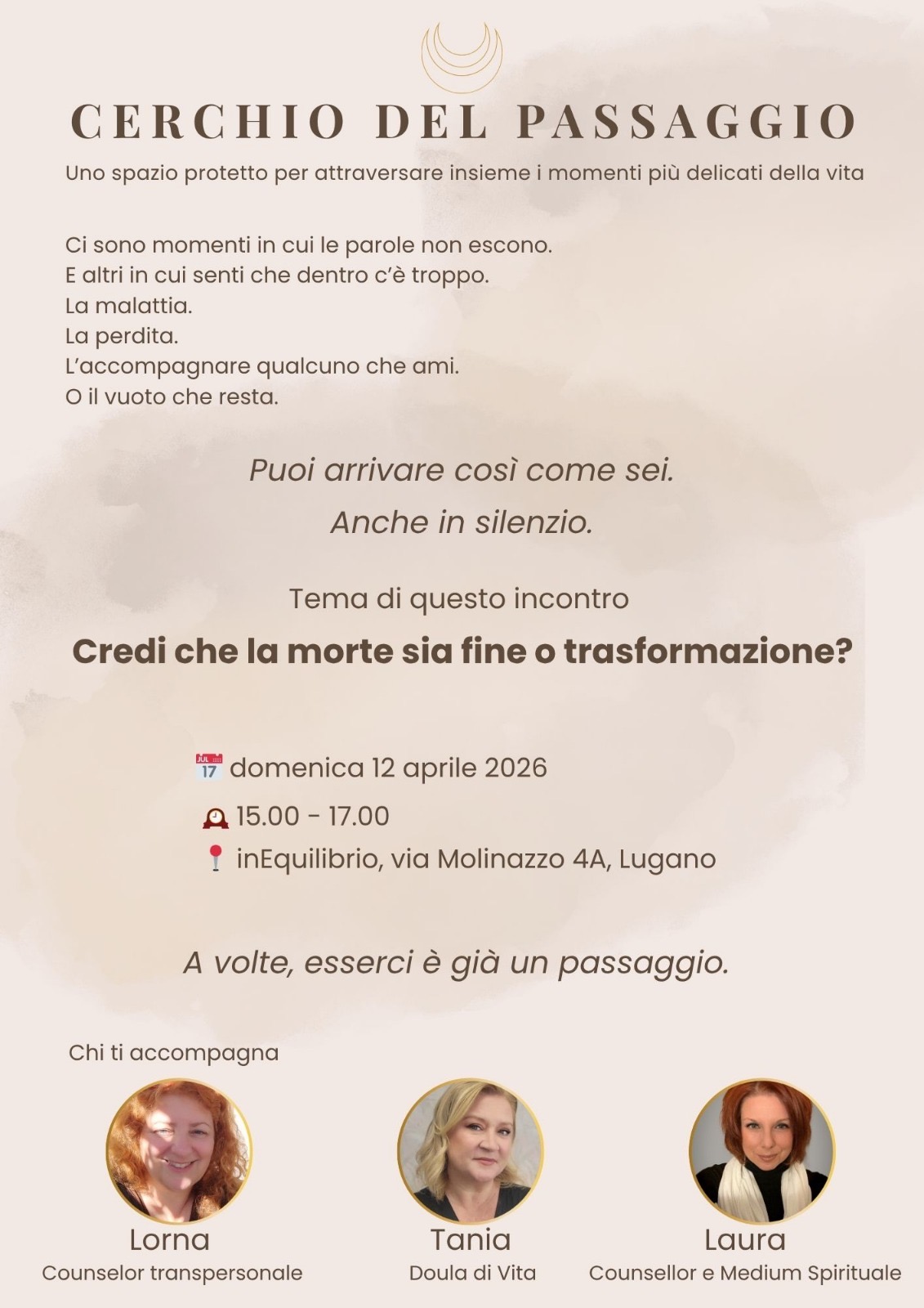 Spazio protetto per attraversare insieme i momenti più delicati della vita con Laura Domeniconi (Counsellor e Medium Spirituale), Lorna Fasano (Counsellor Transpersonale) e Tania Negrini (Doula di vita)